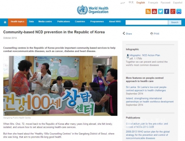 WHO는 최근 인터넷 홈페이지에 ‘한국의 지역사회에 기반한 비전염성질환 예방(Community-based NCD prevention in the Republic of Korea)’이라는 제목으로 ‘건강100세상담센터’를 자세히 소개했다.