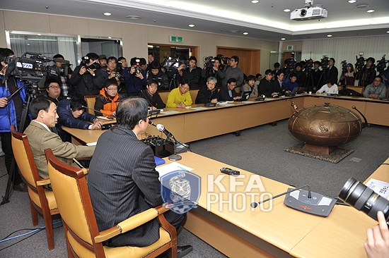 김진국 전무이사가 동석한 이날 기자회견장에는 약 100여 명의 취재진이 몰려 갑작스런 소식을 전했다. 황보관 기술위원장의 입장 발표에 이어 기자단의 날카로운 질문이 쏟아졌고, 대부분의 질의는 기술위원회가 구성되지 않은 상황에서 감독 거취가 결정됐다는 절차상의 문제에 초점이 맞춰졌다.