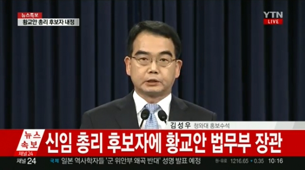 청와대 김성우 홍보수석은 이날 오전 10시 15분 청와대 춘추관에서 브리핑을 갖고 "박근혜 대통령은 오늘 후임 국무총리에 황교안 현 법무장관을 내정했다"고 밝혔다.