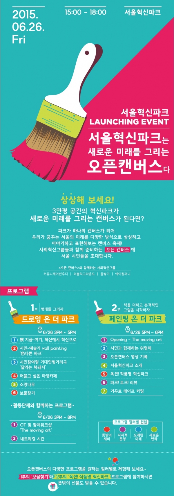 런칭이벤트는 ‘서울혁신파크는 새로운 미래를 그리는 오픈캔버스다’를 주제로 오후 3시부터 6시까지 서울혁신파크 야외 공간 곳곳에서 펼쳐진다.