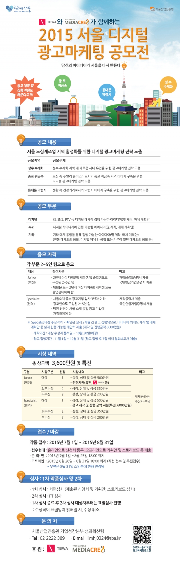 국내 최고의 크리에이티브를 자랑하는 광고 대행사 TBWA와 국내 유일의 방송광고 민영 미디어랩사 SBS 미디어 크리에이트가 후원사로 참여하는 이번 공모전에서는, 디지털 매체를 중심으로 성수 수제화 단지, 종로 귀금속 단지, 동대문 약령시의 알려지지 않은 모습 또는 새로운 모습을 알리기 위한 광고마케팅 전략을 주제로 진행된다.