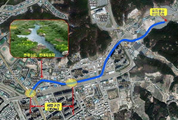 정비 구간은 현대성우오스타아파트~거두사거리 450m이다. 호안을 자연 석축으로 쌓고 여울, 소, 징검다리, 산책로, 어류 서식지를 만든다. 이달 착공해 11월 준공 예정이다.