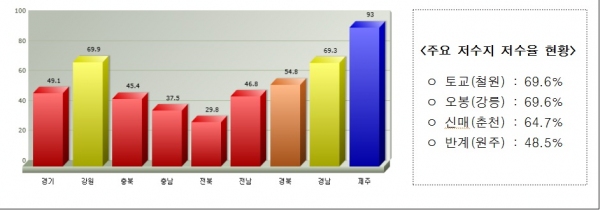 강원도에는 올해 봄 가뭄으로 인해 농작물 시들음 및 생육부진 등의 피해가 발생해 큰 어려움을 겪은 바 있고, 지난 주말 내린 비에도 불구하고 현재 강우량이 평년 1277㎜의 55%수준인 703㎜로서 매우 적은 비가 내린 상태이고 도내 317개 저수지의 저수율은 69.9%로서 다소 여유는 있으나 내년 영농철 용수공급엔 충분치 않은 실정이다.