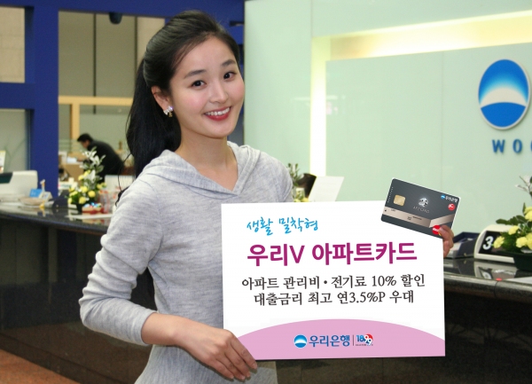 ‘우리V아파트 카드’는 아파트관리비, 전기료를 10% 까지 할인해주는 생활 밀착형 카드로 슈퍼마켓·편의점·버스·지하철·약국에서도 5% 할인이 적용되며 이동통신 요금 자동이체시에도 3%가 할인 되는 등 실생활속에서 할인을 받을 수 있는 혜택으로 구성되어 있다. 월 최대 26,500원씩 연간 최대 318,000원 까지 할인이 가능하다.
