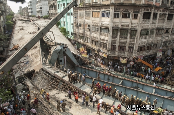 Photo taken on March 31, 2016 shows the collapse site of an under-construction flyover in Kolkata, capital of eastern Indian state West Bengal. At least 20 people have been killed and more than 150 others injured in a under-construction flyover collapse in the eastern Indian city of Kolkata Thursday. snapress@snakorea.com