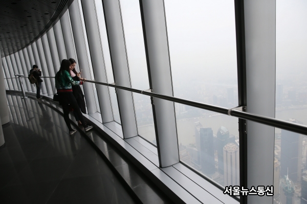 Visitors take a view at the sightseeing platform on the 119th floor of Shanghai Tower in Shanghai, east China, April 10, 2016. The basement and an annex of China's tallest building, the Shanghai Tower, have opened to the public as a trial for opening the rest of the building later this year, said local authorities on April 27. snapress@snakorea.com