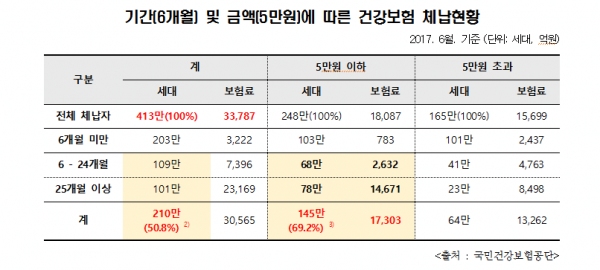 국회 더불어민주당 제윤경(정무위원회) 의원이 국민건강보험공단에서 제출받은 17년 6월 기준 ‘생계형 체납자 관련통계’에 따르면, 건강보험료 체납자 전체 413만 세대 중 6개월 이상의 장기 체납자는 210만 세대로 50.8% 인 것으로 조사됐다.