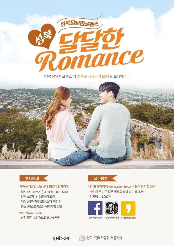 ‘성북 달달한 로맨스’는 바쁜 직장생활로 아직 인연을 찾지 못한 성북구 거주 또는 소재 직장인 미혼남녀를 대상으로 만남의 기회를 제공하여 결혼에 대한 긍정적인 사회분위기를 조성하고자 마련됐다.