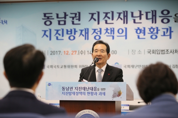 정 의장은 “우리나라는 지난해 경주 지진에 이어 올해는 포항 지진을 겪으면서 지진 안전지대라는 믿음이 흔들리고 있다”면서 “지진 안전지대라는 안일한 상황 인식에서 벗어나 국민의 생명과 재난 피해를 최소화하기 위해 능동적 대응방안을 모색할 때”라고 말했다.