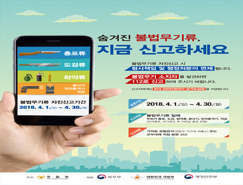 경찰청 주관, 법무부·국방부·행정안전부 합동…불법무기류 소지하면 10년 이하의 징역, 2천만원 이하의 벌금형