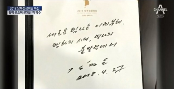 김 위원장은 이날 문재인 대통령과 함께 회담장인 판문점 평화의 집으로 이동, 1층에 있는 방명록에 "새로운 력사(역사)는 이제부터. 평화의 시대, 력사의 출발점에서"라고 썼다.