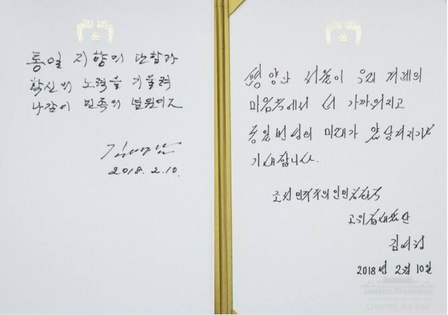 문재인 대통령은 옆에서 웃으며 이를 지켜봤다. 김 위원장은 방명록 옆에 준비된 펜 대신 여동생인 김여정 노동당 중앙위원회 제1부부장이 건네준 몽블랑 펜으로 방명록을 작성했다.