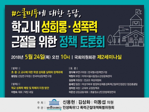 이번 토론회는 #스쿨미투가 연일 터져 나오며 학생과 학부모들이 불안에 떨고 있는 시점에서 학교 내 성희롱‧성폭력 실태를 파악해보고, 이에 대한 해결방안을 논의하고자 마련되었다.