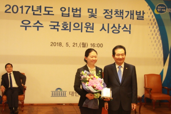 ‘입법 및 정책개발 우수의원’은 한 해 동안 국회의원들의 법률안 대표발의·가결 건수, 본회의 및 상임위원회 출결실적 등 전반적인 의정활동을 기준으로 국회사무처에서 심사하고 국회의장이 직접 시상하는 입법 분야 최고 권위의 상이다.