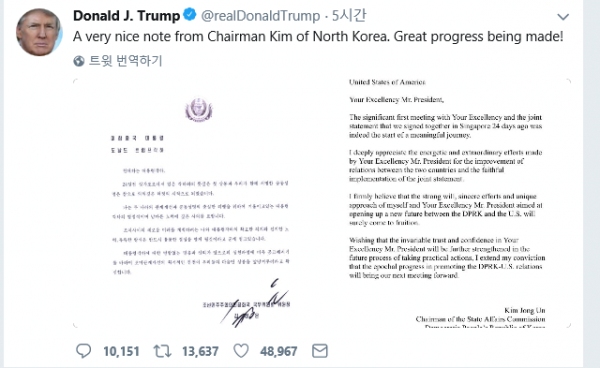 트럼프 대통령은 이날 트위터를 통해 "북한 김(정은) 위원장으로부터의 아주 멋진 편지. 아주 큰 진전이 이뤄지고 있다"고 말했다.