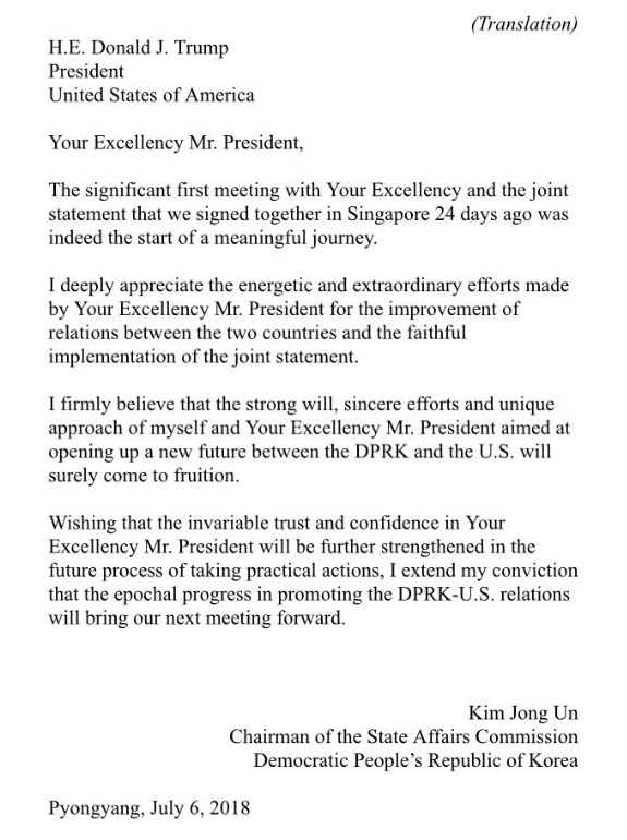 앞서 트럼프 대통령이 지난 5월 24일 6·12 싱가포르 북미정상회담 취소를 통보하면서 김 위원장에 대한 공개서한 형식을 취한 바 있으나, 정상 간에 주고받은 친서를 한쪽이 공개하는 것은 극히 이례적이다.