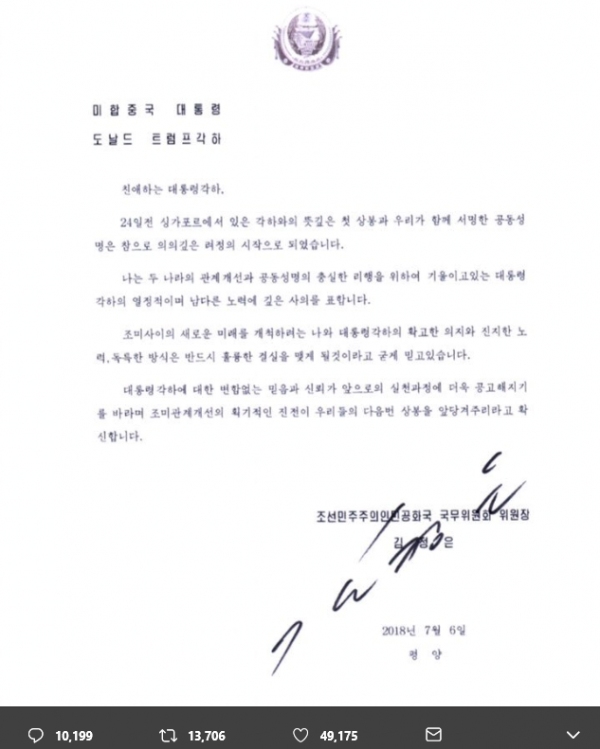 이어 김 위원장이 서명한 한글로 작성된 친서와 이를 번역한 영문본을 각각 첨부했다.