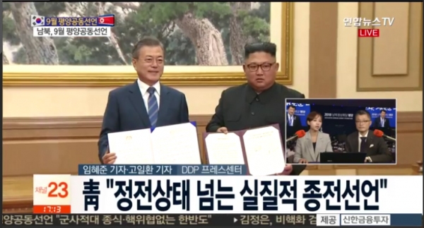 문재인 대통령과 김정은 북한 국무위원장은 19일 평양 백화원 초대소에서 '9월 평양공동선언'에 서명하고 공식 발표했다.