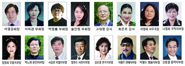 회장, 이영길(동양화가), 수석부회장(시나리오작가. 문학평론가), 부회장 이하경(미술), 박정봉(국악), 송민정(무용), 김모경(연극), 감사는 고대영(시인.문학), 최은호(국악), 이정희 사무국장으로 집행부가 구성되었고, 국악지부장 나정희, 무용지부장 장정희, 문인지부장 박노빈, 미협지부장 서길호, 연극지부장 김모경, 연예지부장 이평주, 음악지부장 신동열, 사진지부장 정연수, 영화지부장 박병두, 총 9개 지부장이다.