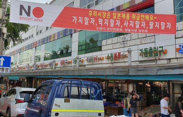 수원시전통시장상인연합회는 최근 “일본정부가 경제 보복 조치를 철회할 때까지 일본제품은 사지도, 팔지도 않겠다”면서 일본제품 판매중단을 선언하고, 불매운동에 동참하겠다고 선언했다.