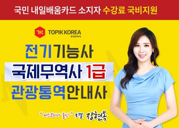 한국토픽교육센터는 미스코리아 출신 모델 장현옥과 SBS "웃찾사” 출신 개그맨 이수한, “땡잡았어요”, “토닥토닥”트롯가수 향기와‘잡고싶다’발라드가수 구정현이 홍보대사이다. 서울시교육청 산하 동작관악교육지원청 원격평생교육시설인가를 필한 교육전문기업으로 한국산업인력공단(큐넷) 국가자격증(국가전문자격증·국가기술자격증·국가공인자격증)을 온라인교육을 통해 국비지원한다.