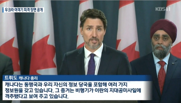 저스틴 트뤼도 캐나다 총리는 이날 수도 오타와에서 기자회견을 하고 "캐나다 자체 정보당국과 동맹국들로부터 다수의 정보를 확보했다"며 "이들 증거는 우크라이나 여객기가 이란의 지대공 미사일에 맞아 추락했다는 것을 보여준다"고 말했다. 그러면서 "고의는 아니었을 수 있다"고 덧붙였다.