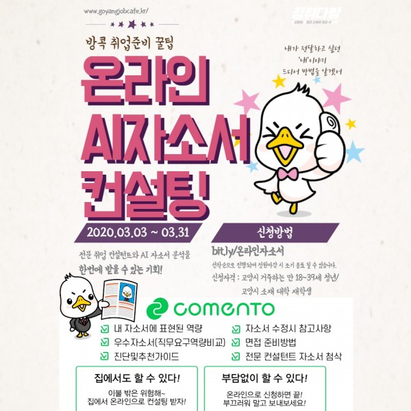 【고양=서울뉴스통신】 김현채 기자 = 고양시(시장 이재준)가 청년들의 취업과 소통을 지원하는 청취다방에서 코로나19 지역사회 확산 대응 방안으로 비대면 취업서비스인 '온라인 AI자기소개서 컨설팅'을 지난 3일부터 시작했다고 밝혔다.