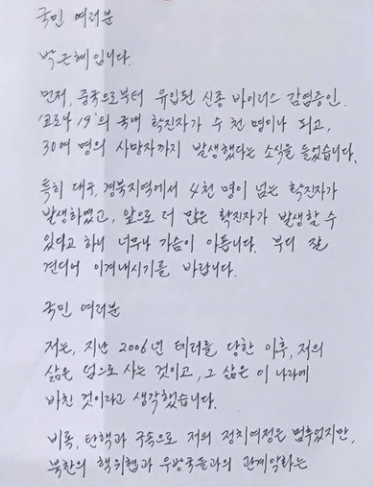 앞서 유영하 변호사는 전날 국회 정론관에서 기자회견을 열고 박 전 대통령의 옥중 친필메시지를 공개했다.
