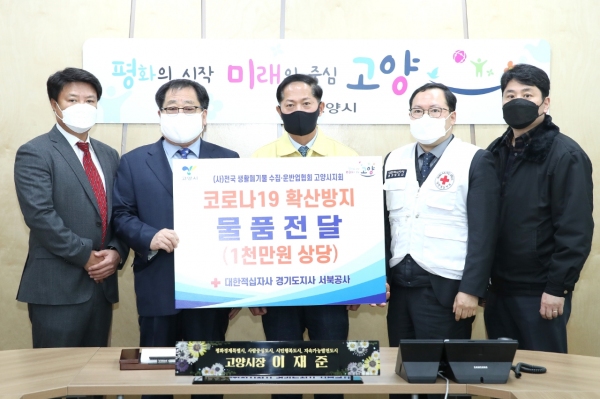 이 날 전달식에는 고양시장 및 (사)한국생활폐기물협회 고양시지회장, 대한적십자사 경기도지사 서북봉사관장이 참석하였으며, 전달되는 손세정제 및 소독제는 시민들이 자주 방문하는 전통시장 등에서 코로나19 예방 및 방역을 위해 사용될 예정이다.
