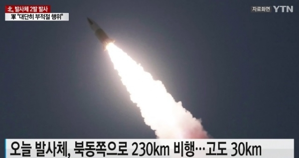 29일 합동참모본부에 따르면 북한은 이날 오전 6시 10분께 강원도 원산 일대에서 북동쪽 동해상으로 단거리 탄도미사일로 추정되는 발사체를 두발을 쐈다고 밝혔다. 발사체 비행거리는 230㎞, 고도는 30㎞로 알려졌다. 이는 지난 21일 북한판 에이태킴스(ATACMS)인 전술지대지미사일을 쏜 지 8일 만의 도발이다.