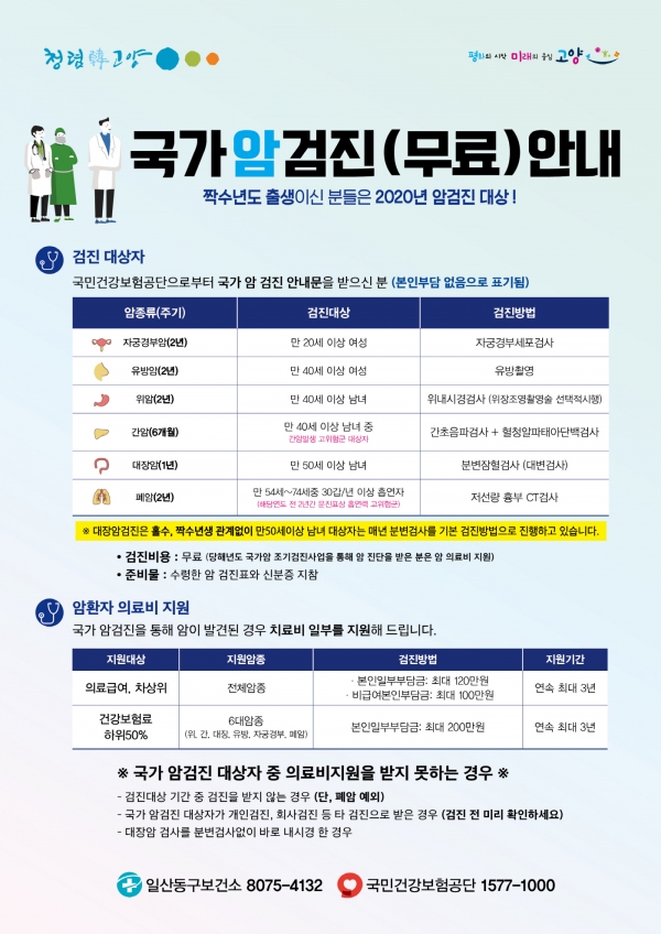 2020년 국가암검진 사업 대상자는 의료급여수급자 및 건강보험료 하위 50% 이하의 짝수년도 출생자로 ▲위암 ▲유방암 ▲간암 ▲대장암 ▲자궁경부암 ▲폐암이 검진항목에 해당된다.