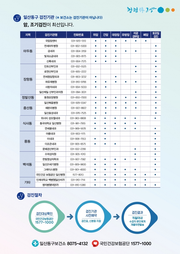 보건소 관계자는 "국가암검진 사업 대상자가 국가암검진을 통해 암으로 확진받은 경우 암 치료비 일부를 지원받을 수 있기 때문에 대상자분들은 올해 안에 국가암검진을 꼭 받으시기를 당부드린다." 고 말했다.