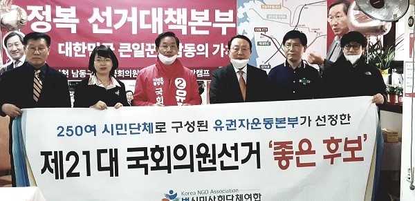 【서울뉴스통신】 이창호 기자 = 전국 250여개 시민사회단체로 이뤄진 범시민사회단체연합은 유정복 미래통합당 인천 남동갑 후보를 '21대 국회의원 선거 좋은 후보로 선정했다' 고 6일 밝혔다.