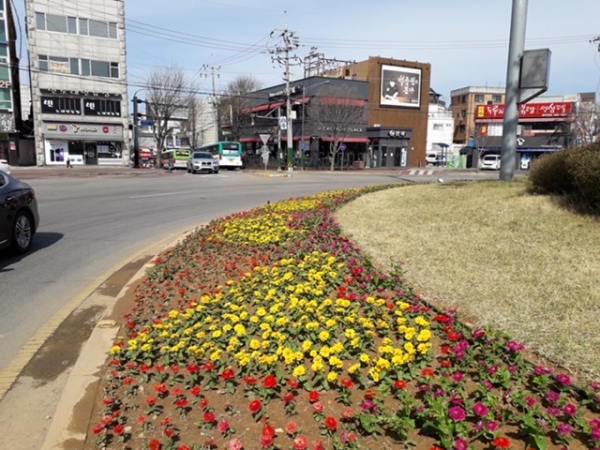 특히 올해는 코로나 19의 지역사회 감염 우려로 움츠러든 시민생활에 활력을 불어넣어주고 침체된 경제활동에 생명력을 전달기 위해 통행이 많은 회전교차로에 봄꽃으로 화단을 조성했다.