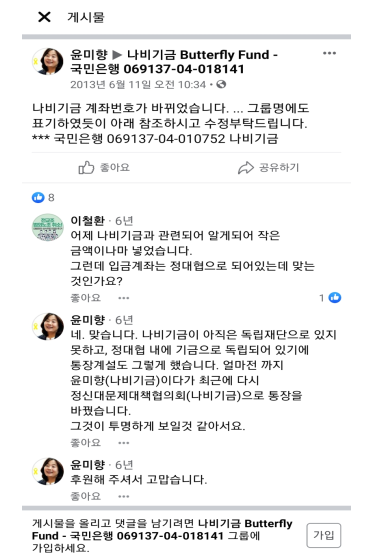 이는 "모두 2014년 이전 발생한 일로 윤미향의 개인계좌 사용과 관련 사실관계 주장부터 허위(http://www.urisuwon.com/28984)"라고 주장했다.