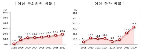 2020년 중앙행정기관 여성 장관은 6명으로 전체 18명의 33.3%를 기록, 2015년을 기점으로 증가 추세에 있다.