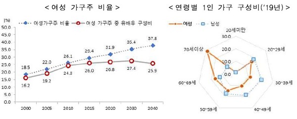2019년 여성 1인 가구는 309만4000가구로 2010년과 비교하여 1.4배 규모로 증가했다. 여성 1인 가구 중 50~60대 비율은 2010년 29.6%에서 2019년 31.4%로 가장 크게 증가했다.