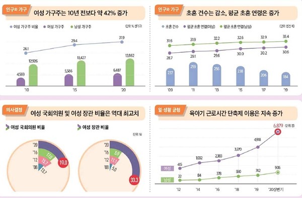 【 서울 = 서울뉴스통신 】 이상숙 기자 =2일 여성가족부와 통계청이 '양성평등 주간'(9월 1∼7일)을 맞아 펴낸 '2020 통계로 보는 여성의 삶' 자료에 따르면 올해 국회의원과 장관 중 여성 비율은 각각 19%, 33.3%로 역대 최고치를 기록했다.