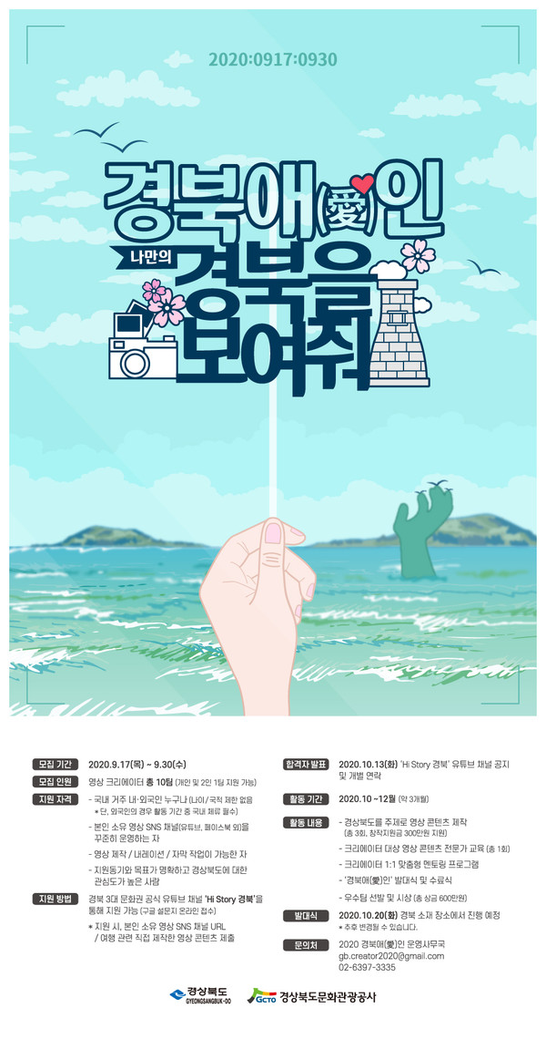 “코로나19로 인한 언택트(Untact) 시대의 개별 관광트렌드에 부합하는 경북의 3대 문화권에서만 경험할 수 있는 차별화된 영상 콘텐츠가 경북애(愛)인들의 톡톡 튀는 아이디어로 만들어지기를 기대한다”고 밝혔다.