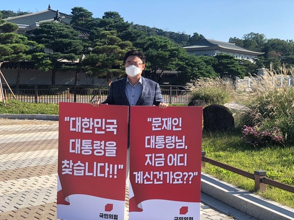주호영ㆍ김성원ㆍ배현진ㆍ곽상도ㆍ전주혜ㆍ배현진 의원 릴레이 1인 시위…김은혜 대변인 "9월 23일 새벽 1시 대통령은 어디에 있었습니까ㆍ대통령의 24시간은 국민이 알아야 할 공공재"… 28일 北 만행 규탄·본회의 촉구 첫 '야외' 의총