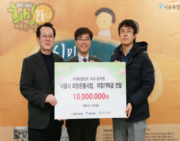 시는 21일 서울시청에서 락플란트치과그룹, 서울시복지재단과 함께 희망온돌사업의 기부금 전달식을 가졌다. 전달식에는 복성철 락플란트치과그룹 대표원장, 임성규 서울시복지재단 대표이사, 이충열 서울시 복지정책관이 참석했다.