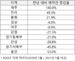 국내 골프 부킹서비스 XGOLF가 2021년 5월 기준으로 지역별 예약률 현황을 분석해본 결과, 전년에 비해 △충청권 21.9%, △전라권 49.3%, △제주권 140.0%로 작년에 비해 큰 상승폭을 보였고 이와 대조적으로 대표 인기 지역들은 △용인권 -53.0%, △경기서북부 -45.8%, △안성권 -28.8%로 하락세를 보였다고 6일 밝혔다.