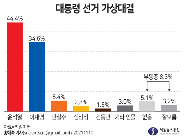 【서울 = 서울뉴스통신】 송혜숙 기자 = 윤석열 국민의힘 대선 후보가 차기 대선 지지도 조사에서 이재명 더불어민주당 대선 후보를 앞설 것이라는 결과가 나왔다.
