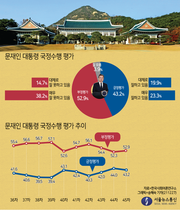 한국사회여론연구소(KSOI)가 TBS 의뢰로 지난 24일부터 이틀간 전국 만 18세 이상 유권자 천명을 대상으로 '문 대통령의 국정수행 평가'를 조사한 결과, 긍정적이라는 응답은 43.2%로 지난달 22일 발표 조사보다 0.1%포인트, 부정평가는 52.9%로 0.3%포인트 각각 상승했다.