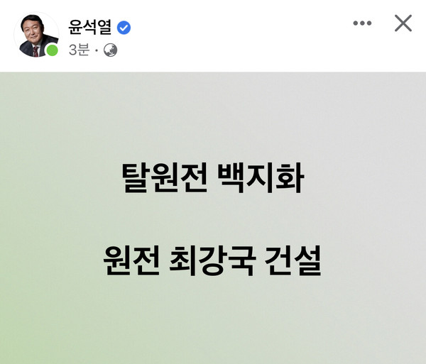 【서울 = 서울뉴스통신】 신현성 기자 =윤석열 국민의힘 대선 후보는 25일 자신의 페이스북에 "탈원전 백지화, 원전 최강국 건설"이라는 한 줄 공약을 발표했다.