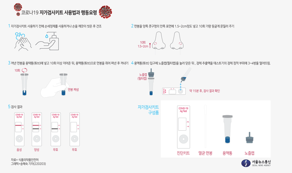 코로나19 자가검사키트 사용법과 행동요령. / 그래픽=송혜숙 기자 【서울 = 서울뉴스통신】 송혜숙 기자 = 식품의약품안전처는 자가검사키트의 원활한 사용을 위해 정확한 사용방법을 3일 발표했다.