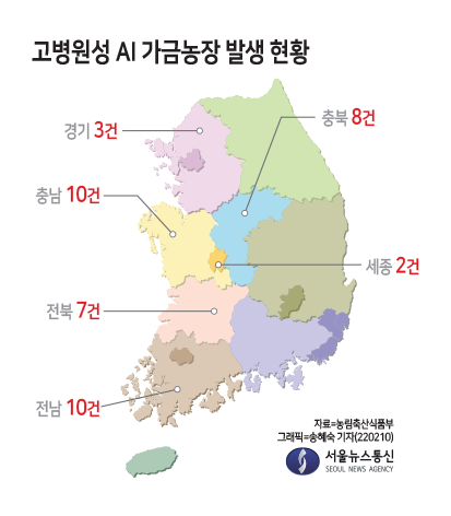 【서울 = 서울뉴스통신】 송혜숙 기자 = 충남 아산 산란계 농장에서 고병원성 조류인플루엔자(AI)가 확진(H5N1형)되면서 전국 가금농장의 AI 발생건수는 세종 2건, 경기 3건, 충북 8건, 충남 10건, 전북 7건, 전남 10건 등 총 40건이다.