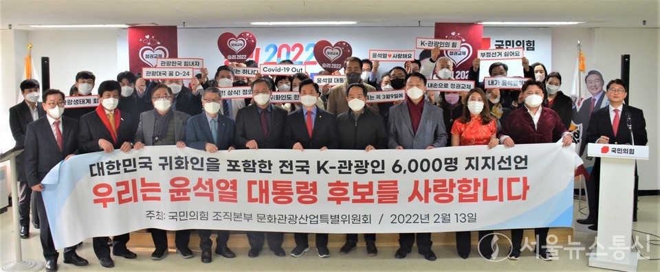 【서울 = 서울뉴스통신】 이민희 기자 =관광산업에 종사하는 대한민국 귀화인 등 전국의 관광인 6000여 명이 제20대 대통령 후보자등록 첫날인 13일, 서울 여의도 대하빌딩에서 국민의힘 윤석열 대통령 후보 지지선언식을 갖고 본격적인 지지세 결집 및 확산에 나섰다.