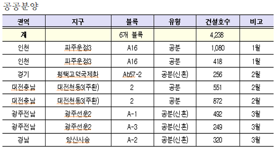 올해 1분기 공급 대상주택은 지난 1월에 공급한 물량을 포함 총 1만31호이고, 1월 2,679호 2월 4,913호, 3월 2,439호에 대한 입주자 모집 공고이 각각 시행된다.