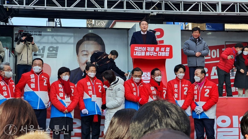 【서울 = 서울뉴스통신】 이민희 기자 =윤석열 국민의힘 대선 후보가 16일 오후 충북 청주시 상당구 성안길에서 열린 '충북의 힘 내일을 만드는 대통령!' 청주 거점유세에서 지지자들에게 인사하고 있다. (사진 = 서울시의회 공동사진취재단)